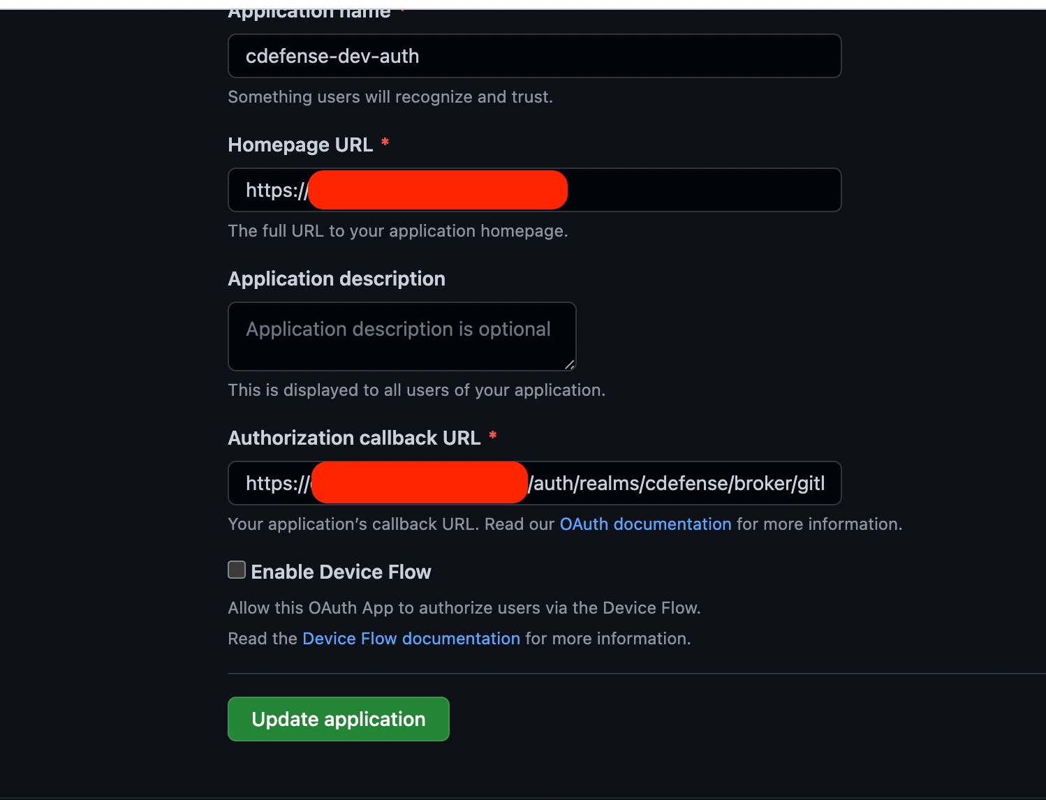Authorization callback URL is https://{base_url}/auth/realms/cdefense/broker/github/endpoint