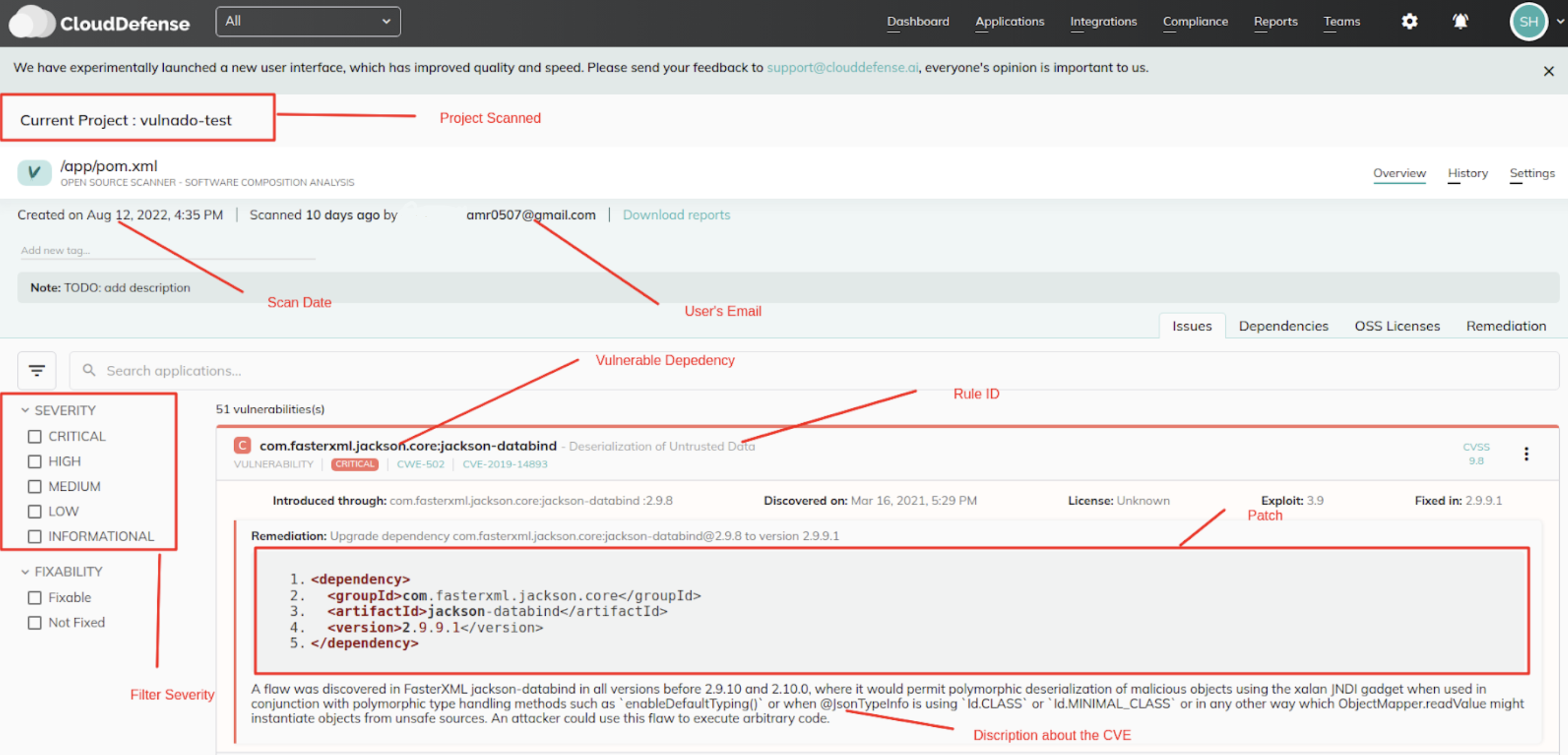 Above picture shows that we scanned a project names “vulnado-test” which has our pom.xml (SCA JAVA) and other scans. Let’s dive into that.